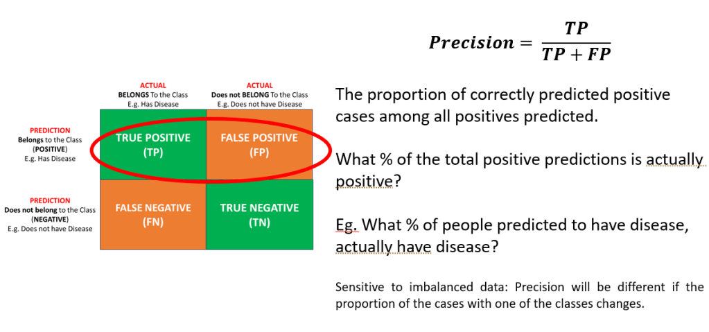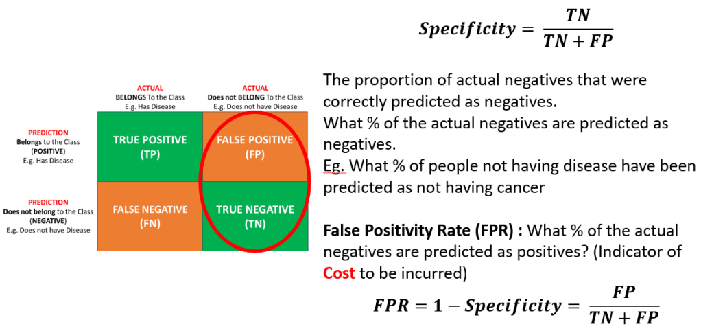 TN: Predicts negative when actually negative (Correct): The model does not predict (correctly) that an item belongs to the selected class.