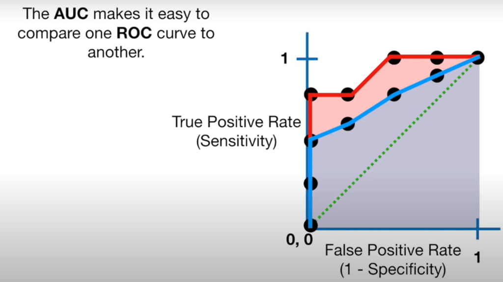 Area Under Curve (AUC) is an indicator of the performance of the model (bigger the area under the ROC curve greater the performance).