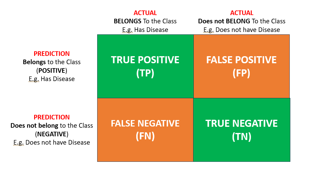 TN: Predicts negative when actually negative (Correct): The model does not predict (correctly) that an item belongs to the selected class.