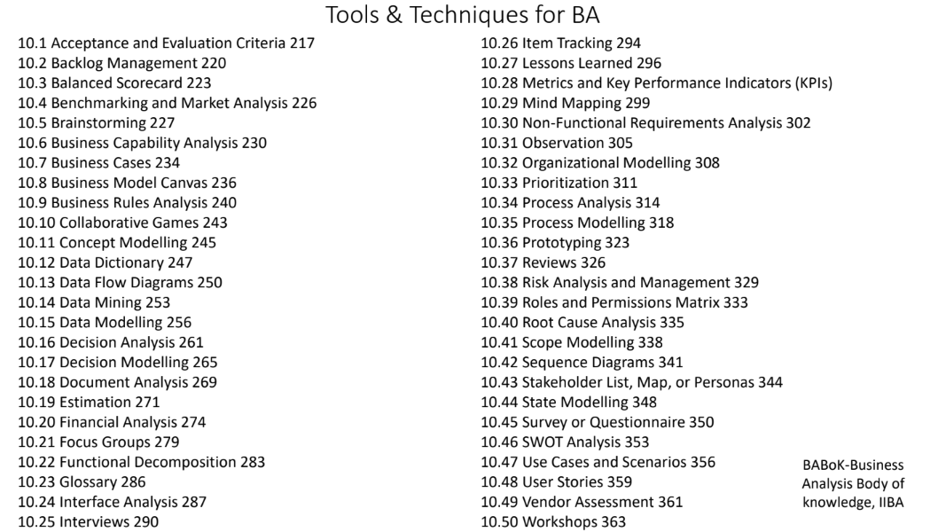 Business Analysis Body of Knowledge identifies a list of 50 techniques critical for any Business Analyst.