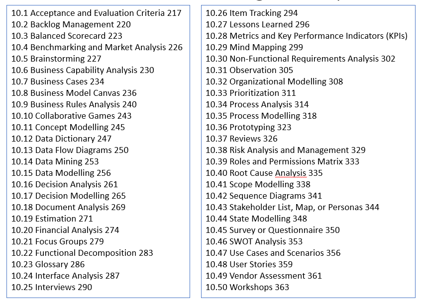 In any profession there are tools and techniques which help the professional to improve his/her productivity and quality. While there are a variety of tools and techniques required for Business Analysis, the following are specifically called out and elaborated in BABoK. Besides this generic set, there will be domain/industry specific tools and techniques required as per the context.