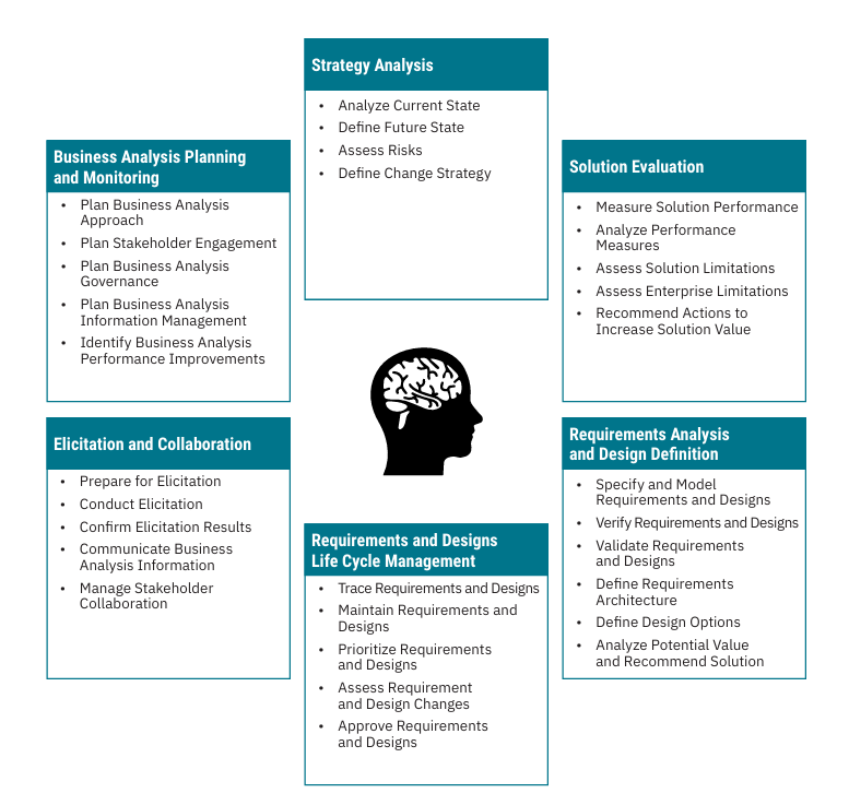 - Requirements Analysis and Design Definition: structure and organize requirements, specify and model requirements and designs, validate and verify information, identify solution options, and estimate the potential value of each option