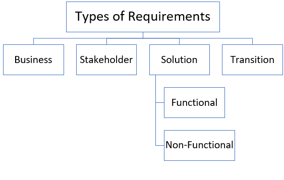 - Non-functional requirements or quality of service requirements: do not relate directly to the behavior of functionality of the solution, but rather describe conditions under which a solution must remain effective or qualities that a solution must have.
