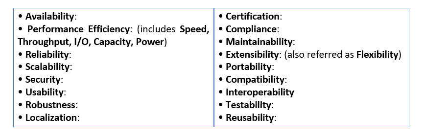 • Performance Efficiency: degree to which a solution or component performs its designated functions with minimum consumption of resources (includes Speed, Throughput, I/O, Capacity, Power)