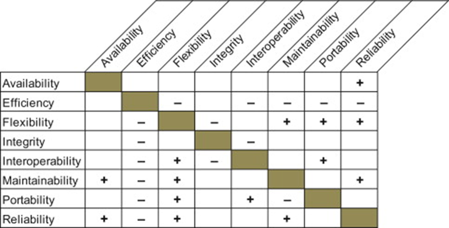 “−” indicates that increasing the attribute in that row adversely affects the attribute in the column.