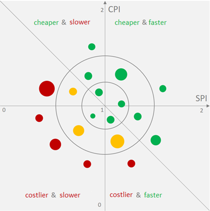 Below is an illustration of using CPI and SPI to know the summary status of various projects. The size of the bubble could be based on one parameter and colour could indicate some other parameter.