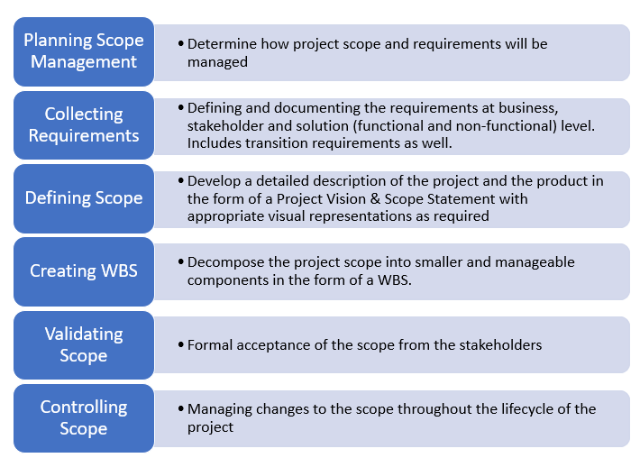 | Scope Management | Plan Scope management, Collect Requirements, Define Scope, Create WBS | Validate Scope Control Scope |