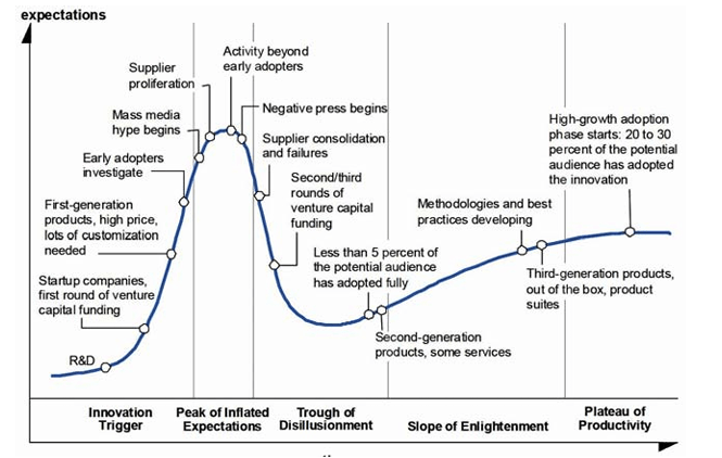 | 2. Peak of Inflated Expectations | Media and analysts fuel enthusiasm. Few successes, many failures. | Avoid over-investing; run pilot projects. |